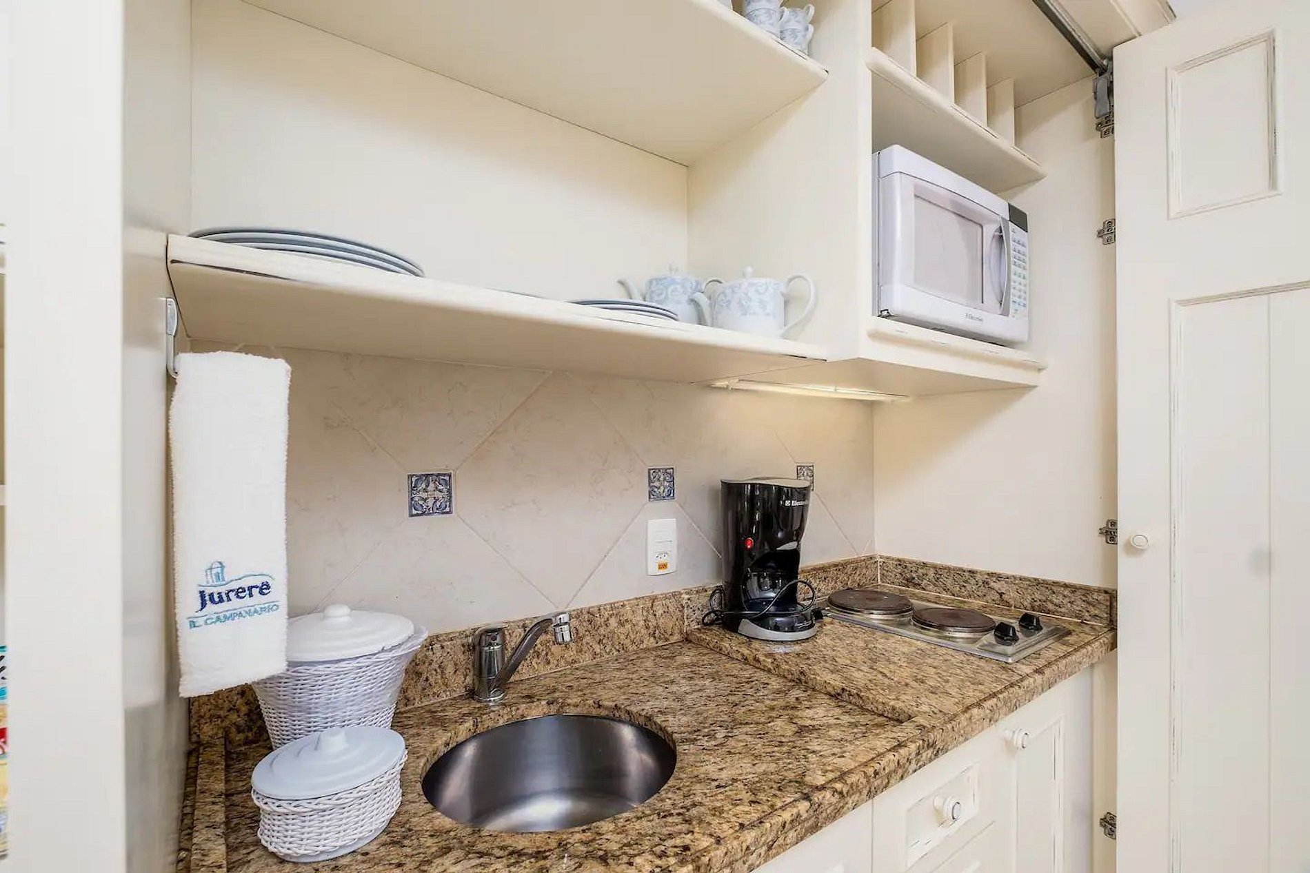 Mini kitchen equipped with a cooktop, microwave, minibar, coffee maker, and utensils for quick meals;