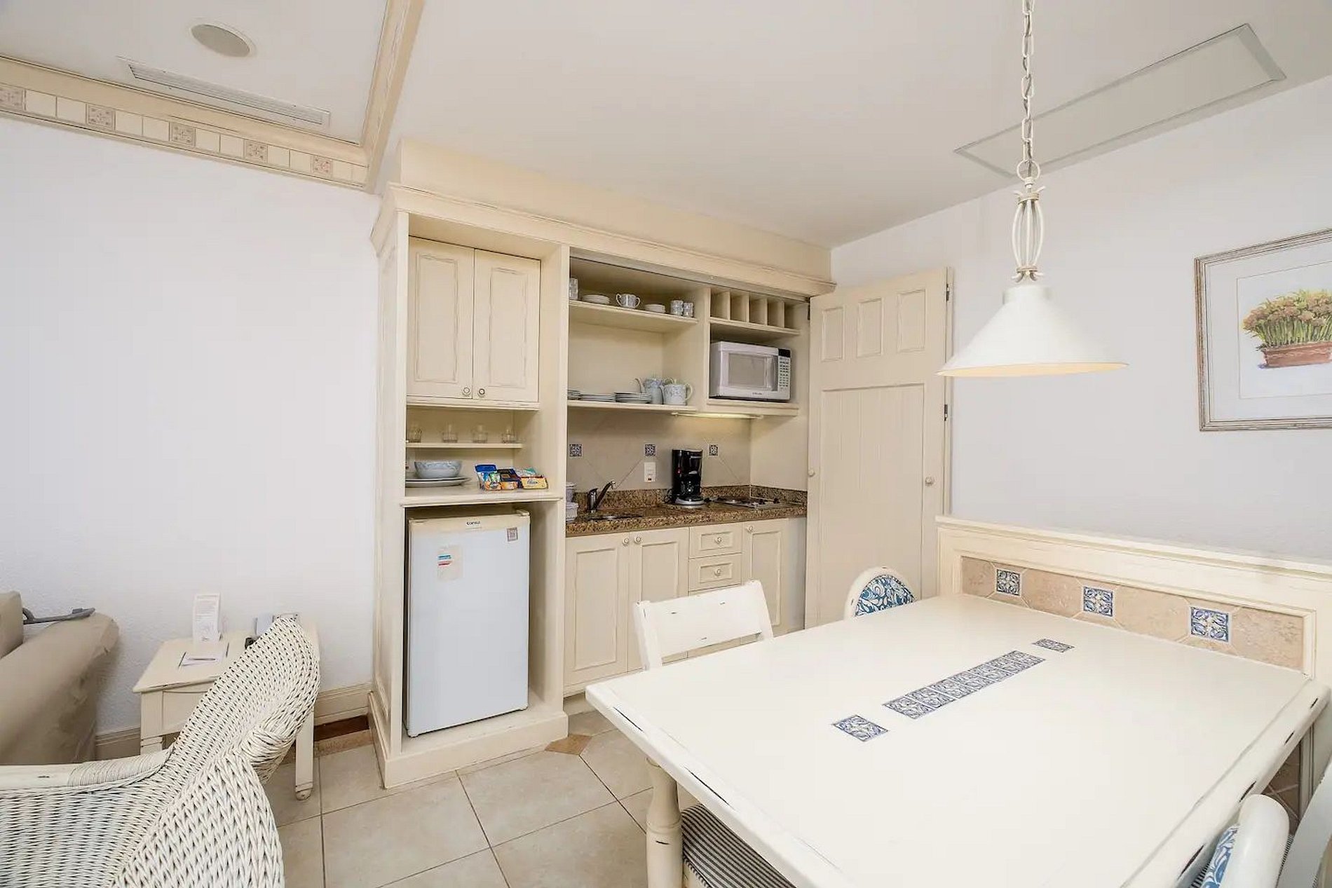 - Mini cozinha equipada com cooktop, micro-ondas, frigobar, cafeteira e utensílios para refeições rápidas;